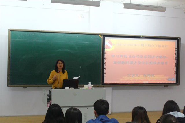 为加强新时期大学生思想政治教育,学习贯彻习总书记系列讲话,十大买球官方网站学生党支部于2018年5月5日下午6:30在行知楼222教室组织开展了《学习贯彻习总书记系列讲话精神,加强新时期大学生思想政治教育》的主题讲座,主讲人为十大买球官网党总支副书记(主持工作)、副院长张裕凤教授。十大买球官方网站第十期积极分子及预备党员,共147名同学参加了本次党课。
