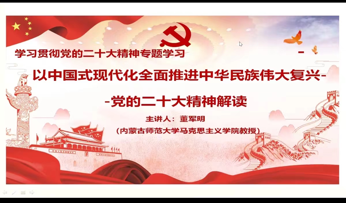 董军明教授从习近平总书记在广西代表团提出的五个“牢牢把握”入手开启了讲座,分别从充分认识党的二十大的重要意义和全面学习领会党的二十大精神两个方面进行了阐述,并着重阐释说明了要深刻认识党的二十大主题、新时代十年的伟大变革、开辟马克思主义中国化时代化新境界和以中国式现代化推动中华民族伟大复兴等四个方面的内容,其中结合了自治区的五大任务,讲到要牢牢把握团结奋斗的时代要求等。讲座条理清晰,叙述深入浅出,内容意蕴深刻,参会的老师均受益匪浅。