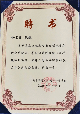 2025年6月15日,中国地理学会基础教育分会成立大会暨新时代地理基础教育高质量发展论坛在南京师范大学举行。中国地理学会党委书记陈发虎院士,中国地理学会副理事长、西南大学杨庆媛教授,中国地理学会监事、首都师范大学李小娟教授,南京师范大学校长华桂宏教授、袁林旺副校长,全国主要师范院校、地理相关院系领导以及从事地理教育相关工作的专家学者、研究生出席会议。成立大会由南京师范大学十大买球官方网站党委书记苏锦主持。会上,南京师范大学十大买球官方网站院长黄昌春教授宣读了“南京师范大学地理基础教育指导委员会”成员名单。指导委员会常务副主任、南京师范大学赵媛教授在发言中阐述了该委员会成立的必要性,强调委员会将有效弥合高等教育前沿研究与基础教育实践之间的鸿沟,推动前沿成果向课程内容的转化。她表示,学校及地科院高度重视这项工作,专门成立了由陈发虎院士、袁林旺副校长领衔、多领域专家组成的指导委员会,旨在打造地理教育“思想库”与“智囊团”,凝聚高校、中小学及科研机构力量,共同服务地理基础教育高质量发展与学科繁荣。十大买球官网徐宝芳教授聘任为南京师范大学地理基础教育指导委员会委员。