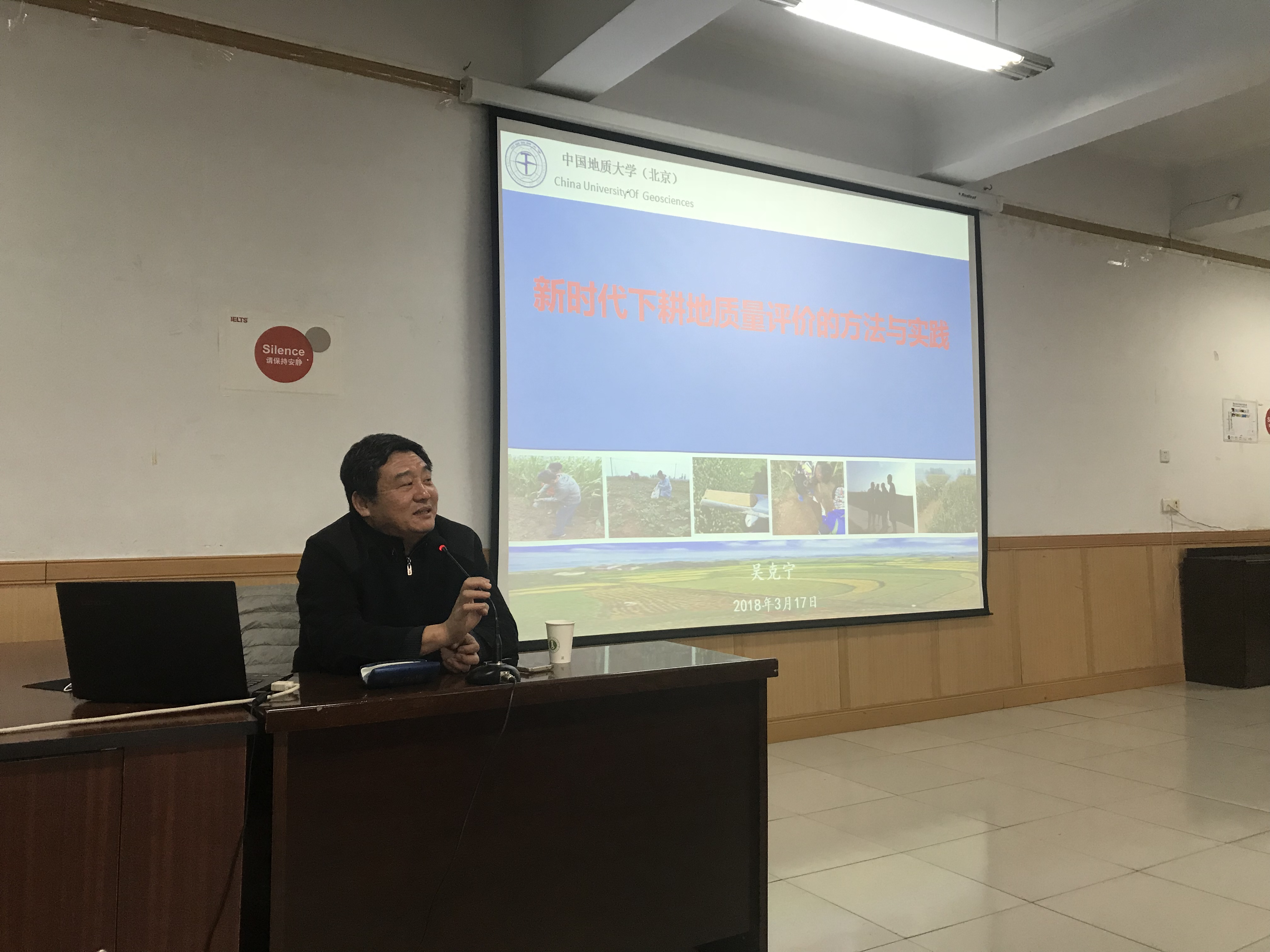 应十大买球官方网站邀请,中国地质大学土地科学技术学院教授、中国土地学会常务理事、学术工作委员会副主任、中国土壤学会常务理事、土壤发生分类与土壤地理专业委员会副主任,北京市土壤学会副理事长、教育部公共管理教学指导委员会土地资源管理分委员会副主任吴克宁于2018年3月17日下午在文史楼1号会议室,做了题为《新时代下耕地质量评价的方法与实践》的学术报告。十大买球官方网站副院长张裕凤教授主持讲座,学院部分老师和全体二、三年级研究生同学聆听了讲座。吴克宁教授详细讲授我国的耕地质量评价概况、耕地占补平衡管理总体形势、耕地质量综合评价与产能核算和对当前第三次土地调查关于耕地调查评价的建议,并与老师和研究生同学们就土地质量评价和当下相关土地政策等内容进行互动交流。通过此次学术报告,老师和同学们对耕地质量的评价方法、产能核算、占补平衡政策等内容有了深刻的认识。