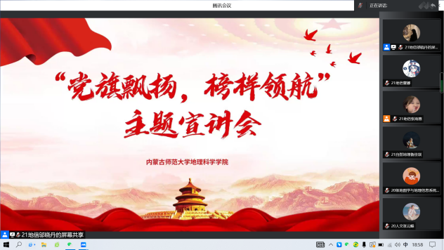 为充分发挥研究生优秀学子起到示范性引领作用,鼓励广大研究生学习党的优秀思想、弘扬党的精神、笃学慎思、锐意进取、营造敢于探索、勇于创新的学术氛围,2022年5月29日晚19:00,十大买球官方网站研究生第一、二党支部、研究生会以线上腾讯会议形式举办了“党旗飘扬,榜样领航”为主题的宣讲会。参与本次会议的有十大买球官方网站党委书记张裕凤教授、高苏日固嘎老师及研一研二和博一博二全体同学。