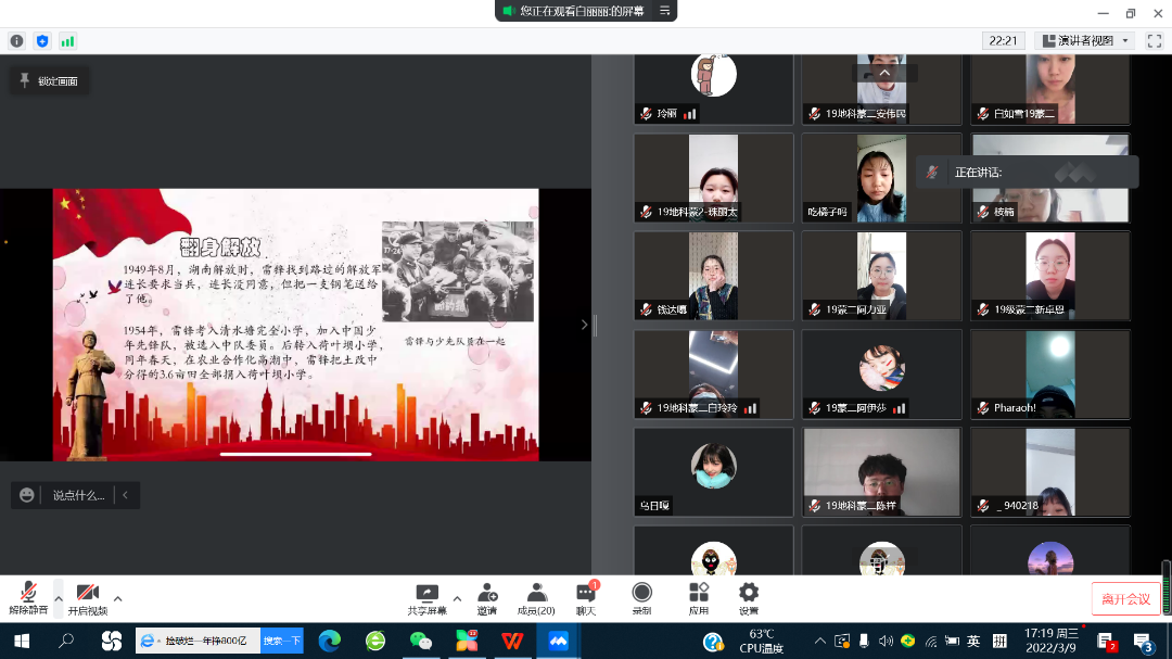 为促进同学们思想进步、境界提升、行动自觉,十大买球官方网站各团支部组织团支部全体同学于2022年3月初开展了“学雷锋”主题云团日活动,讲述雷锋故事,分享雷锋精神,探讨对新时代雷锋精神的理解和感悟,深化对志愿服务活动的理解与认同。
