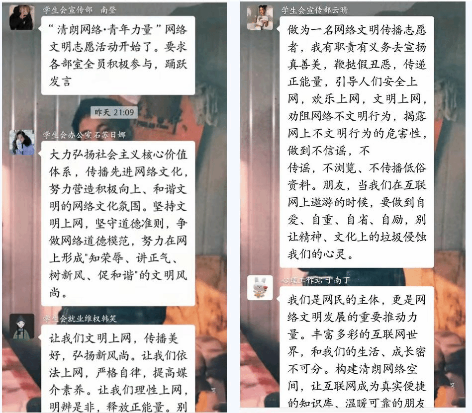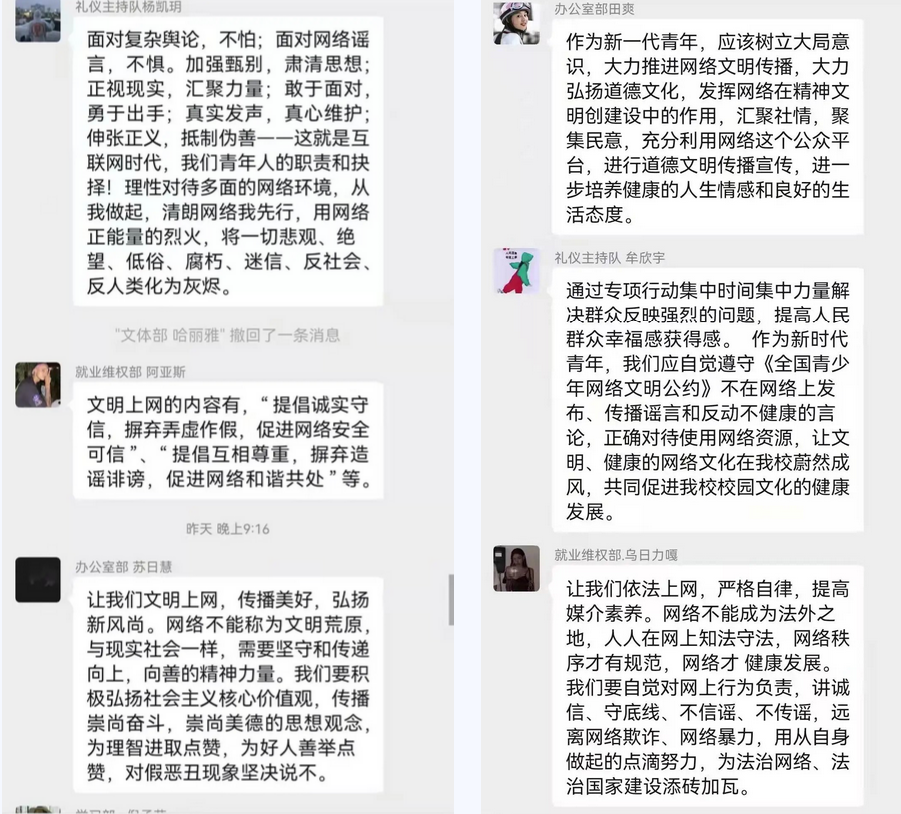 为进一步培育和践行社会主义核心价值观,切实维护国家意识形态安全,动员广大青年积极参与构建网络安全空间,2022年3月4日21:00十大买球官网志愿者服务总组织队各部室成员开展“清朗网络,青年力量”活动。通过微信参与有关网络文明话题讨论,引导同学们规范网络语言、举报不良信息、抵制网络谣言,帮助学生树立正确的网络观念,文明上网。